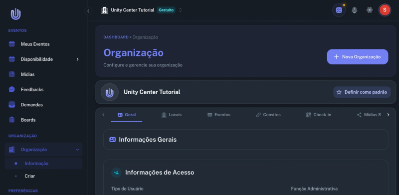 Acesse a página da sua organização clicando em Organização no menu lateral. Você verá a aba Geral com as informações básicas, como nome da organização, plano atual e dados de acesso.