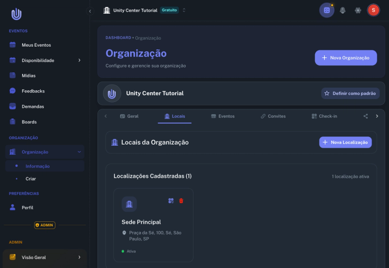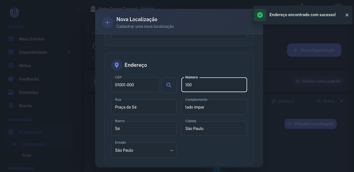 Aprenda a criar unidades (localizações) na sua organização — cadastre endereços com busca automática por CEP.