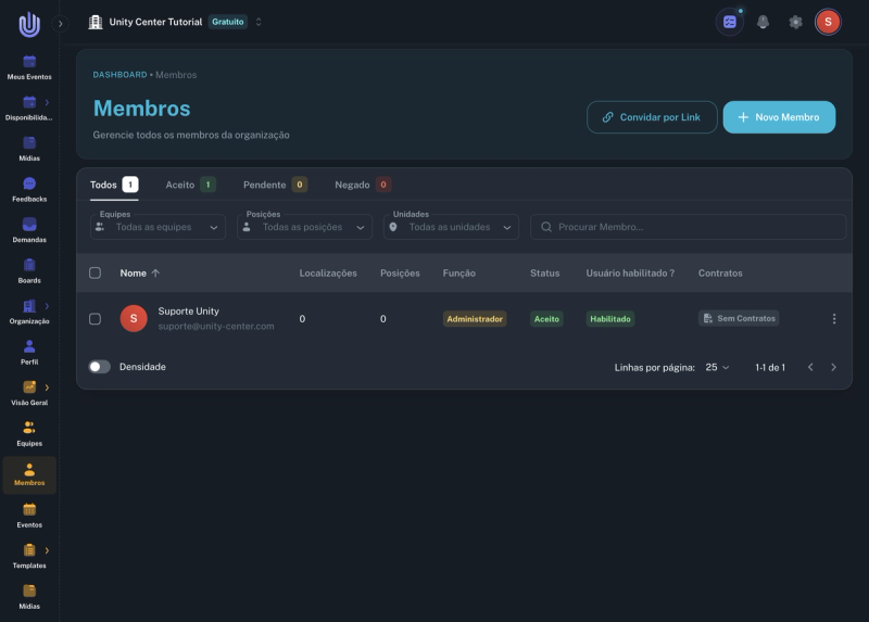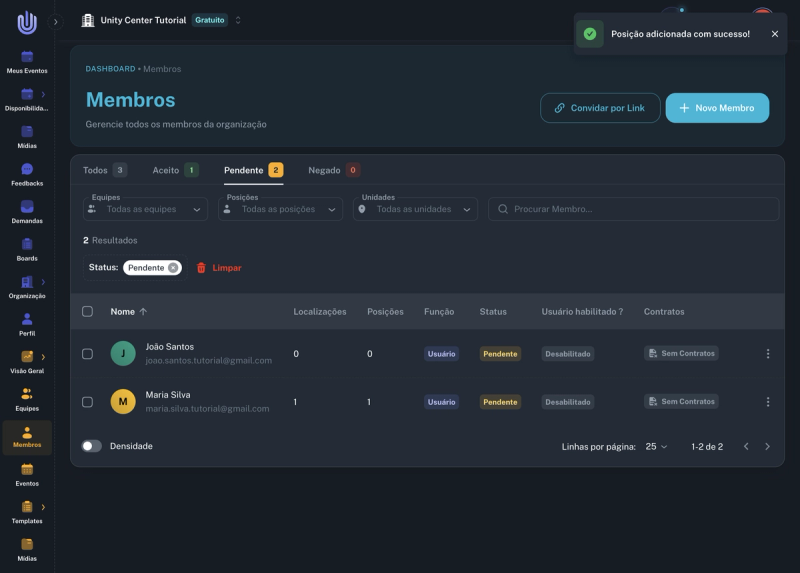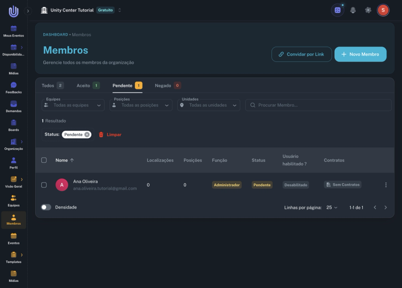 Após convidar os membros, clique na aba Pendente para visualizar todos os convites enviados. Os membros convidados aparecerão com status "Pendente" até aceitarem o convite.