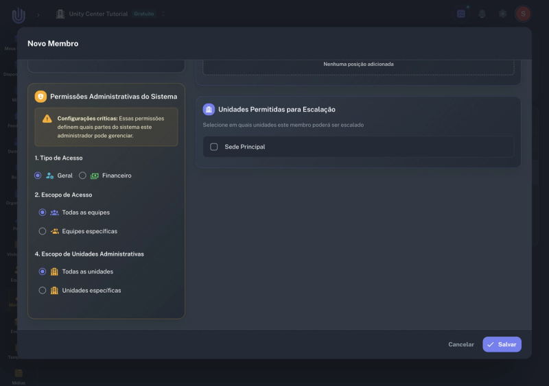 - Escopo de Unidades: Defina se o admin pode gerenciar todas as unidades ou apenas unidades específicas