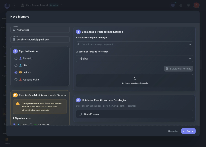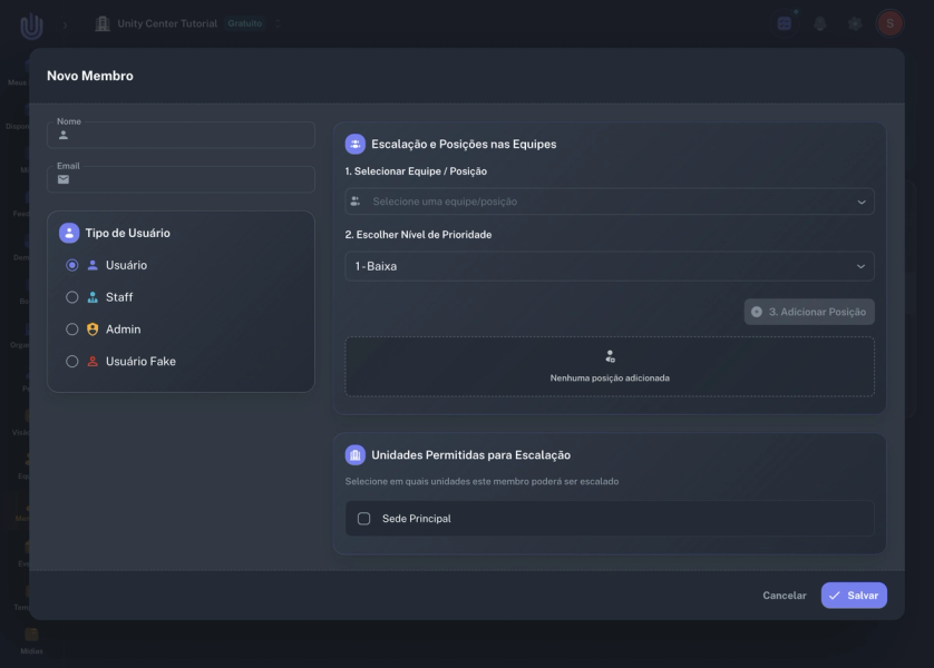Clique no botão Novo Membro para abrir o diálogo de criação. O formulário apresenta campos para Nome, Email, seleção de Tipo de Usuário, Escalação e Posições nas Equipes e Unidades Permitidas para Escalação.