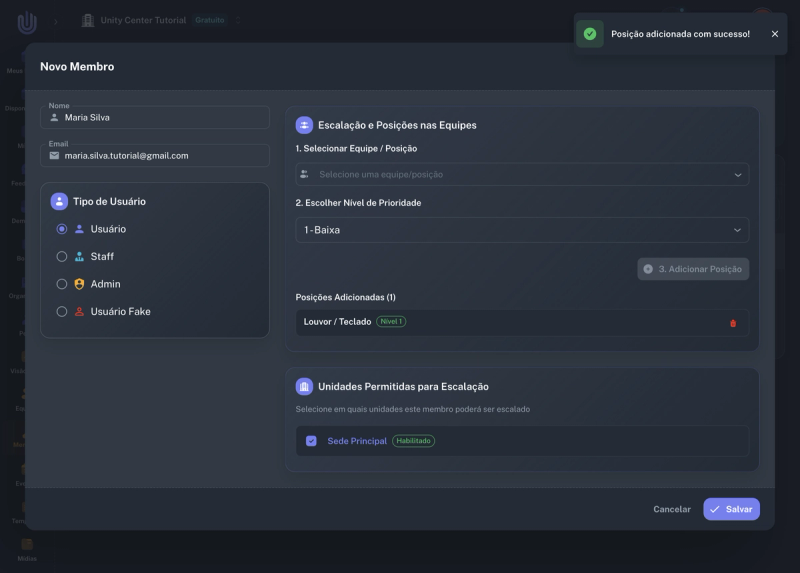 Preencha o Nome e o Email do membro. Selecione uma posição no campo de escalação e clique em Adicionar Posição. Marque a unidade permitida para que o membro possa ser escalado. Clique em Salvar.
